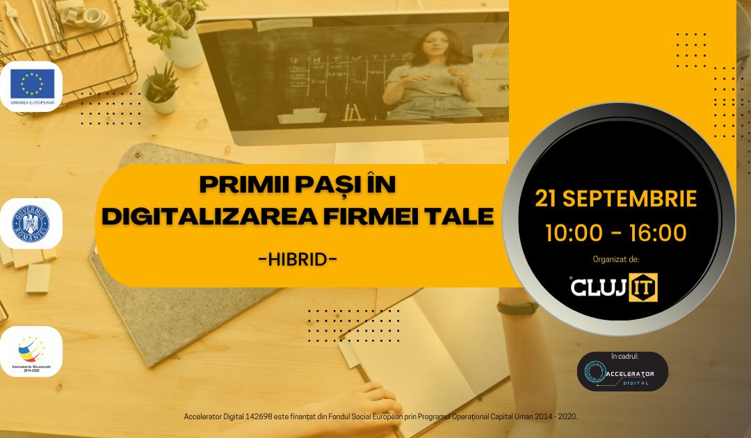 Pe 21 septembrie, în intervalul 10:00 – 16:00, va invităm la Cluj-Napoca pentru o sesiune de lucru interactivă în format fizic, care va acoperi aspecte esențiale despre primii pași în digitalizarea companiilor românești.